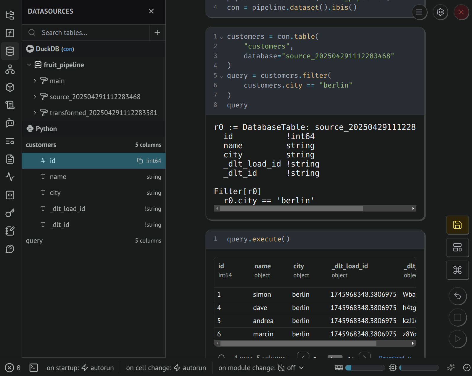 You can also retrieve Ibis tables (lazy expressions) using Python. The Datasources panel will show under Python the output schema of your Ibis query, and the cell output will display detailed query planning.